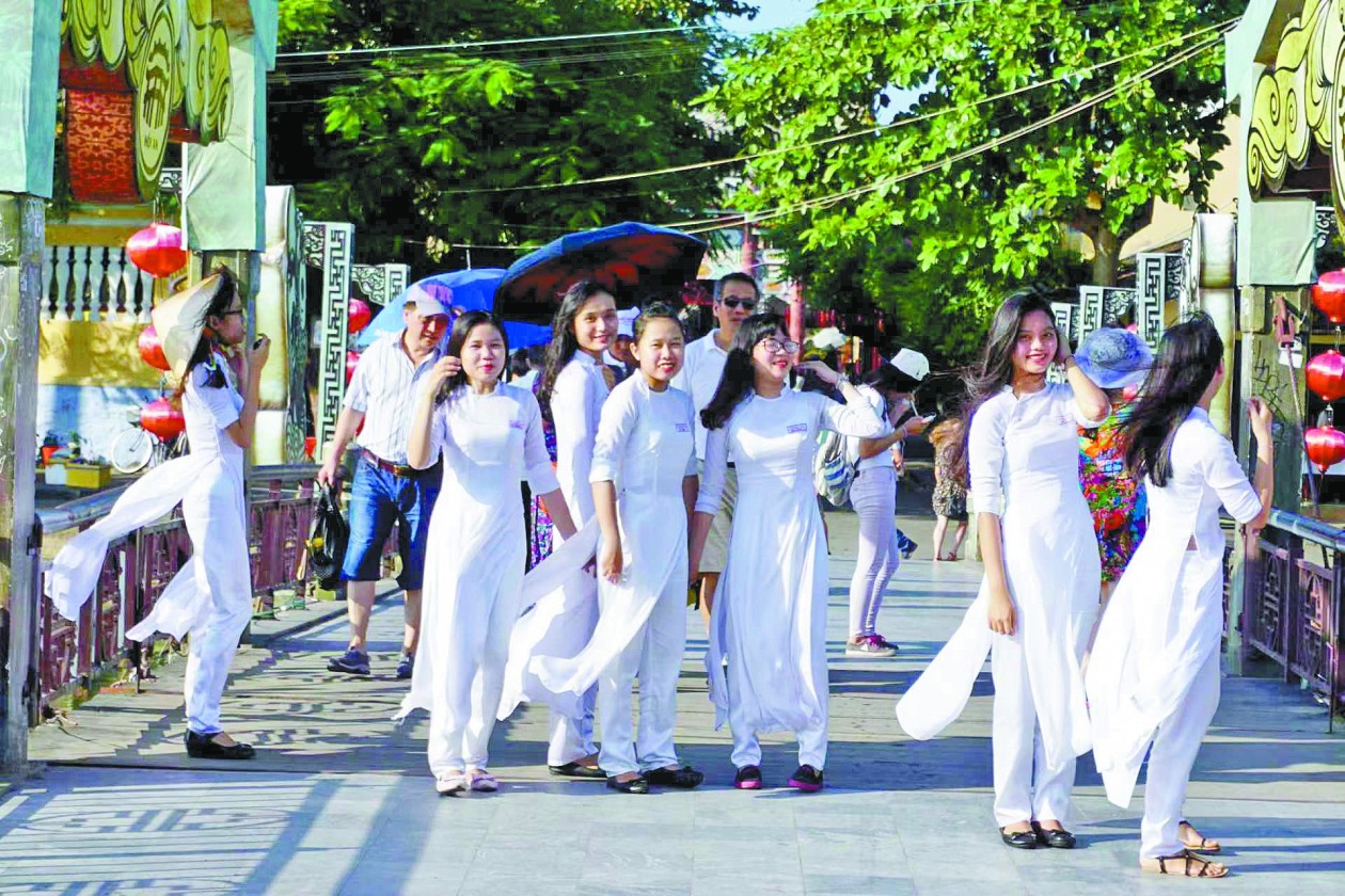 夕阳下,秋盆河被染成琥珀色,沿河的商铺纷纷点亮绸制灯笼——圆的、菱形的、六角的,红的、黄的、蓝的,光影投在河面上,像是打翻了一盒胭脂。人们在石桥上拍照,本地少女喜着奥黛,骑着自行车从人群中轻盈穿过。奥黛是越南国服,形似中国旗袍:高开衩的丝绸长衫下配宽松长裤,行走时衣袂翻飞,宛如一朵移动的莲花。